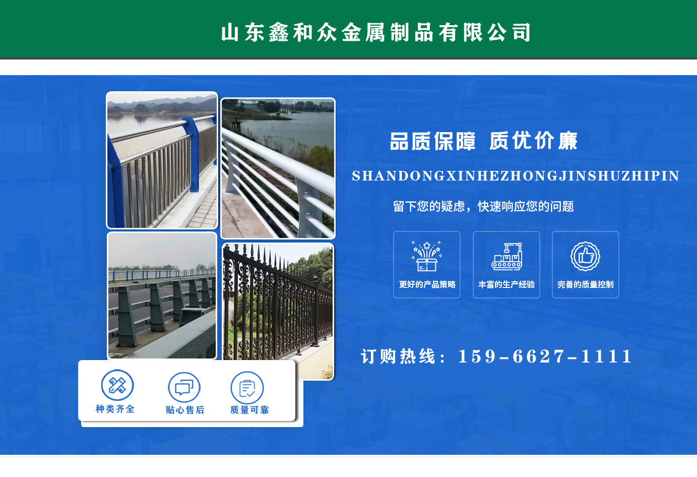 山東鑫和眾金屬制品有限公司主要產(chǎn)品有防撞護欄,橋梁護欄,道路護欄,河道護欄,不銹鋼護欄等護欄。提供設計方案,一站式定制,包您滿意價格優(yōu)惠,歡迎來電咨詢! 公司常年從事銷售護欄防撞護欄,橋梁護欄,道路護欄,河道護欄,不銹鋼護欄,橋梁鋼護欄,河道燈光護欄等。產(chǎn)品廣泛應用于橋梁、河道、旅游景區(qū)、道路、公路、公園、小區(qū)、景觀、道路防撞等領域?! 」井a(chǎn)品均采用優(yōu)質(zhì)不銹鋼材料,符合相關標準。各種型號不銹鋼復合管及護欄,質(zhì)量嚴格把控。產(chǎn)品強度高、耐腐蝕、焊接牢固、抗沖擊、性能好,防撞護欄結(jié)構(gòu)簡單、美觀實用大方?! g迎前來訂購!...